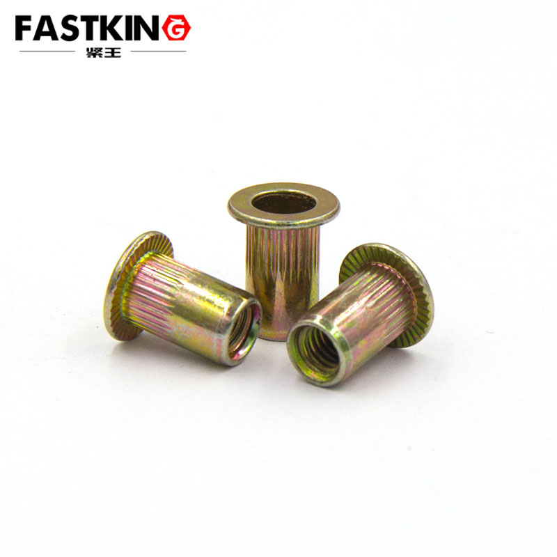 在使用与选型过程中,需注意几个关键要点以充分发挥彩锌拉铆螺母的性能。首先是根据工件材质与厚度选择合适规格:若工件为铝合金、塑料等软质材料,应选择铆接段较长、法兰边较大的型号,以增大接触面积,避免工件被压伤;若工件厚度较薄(<1mm),则需选择薄壁型螺母,防止铆接时工件过度变形。其次是注意安装时的拉力控制:拉力过小会导致铆接不牢固,拉力过大则可能使螺母断裂或工件变形,需根据螺母规格(如 M3、M8)与工件材质,参照厂家提供的拉力参数调整拉铆枪压力,确保铆接效果。最后是避免在强腐蚀环境中滥用:虽然彩锌镀层的防腐蚀性较强,但在强酸、强碱(如化工车间、海边高盐雾环境)中,仍建议选择不锈钢材质或额外做防腐处理,以免镀层快速失效导致螺母锈蚀。